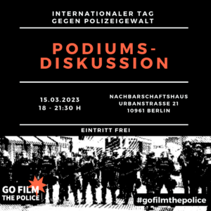 Wir möchten Euch herzlich zu unserer Gesprächsrunde zur Kampagne “Go Film The Police” am Internationalen Tag gegen Polizeigewalt einladen. Es ist die Aufforderung rassistische Polizeigewalt zu filmen, um die Brutalität der Polizei als organisierte Gewalt sichtbar zu machen und Rechenschaftspflicht einzufordern. Uns geht es um: